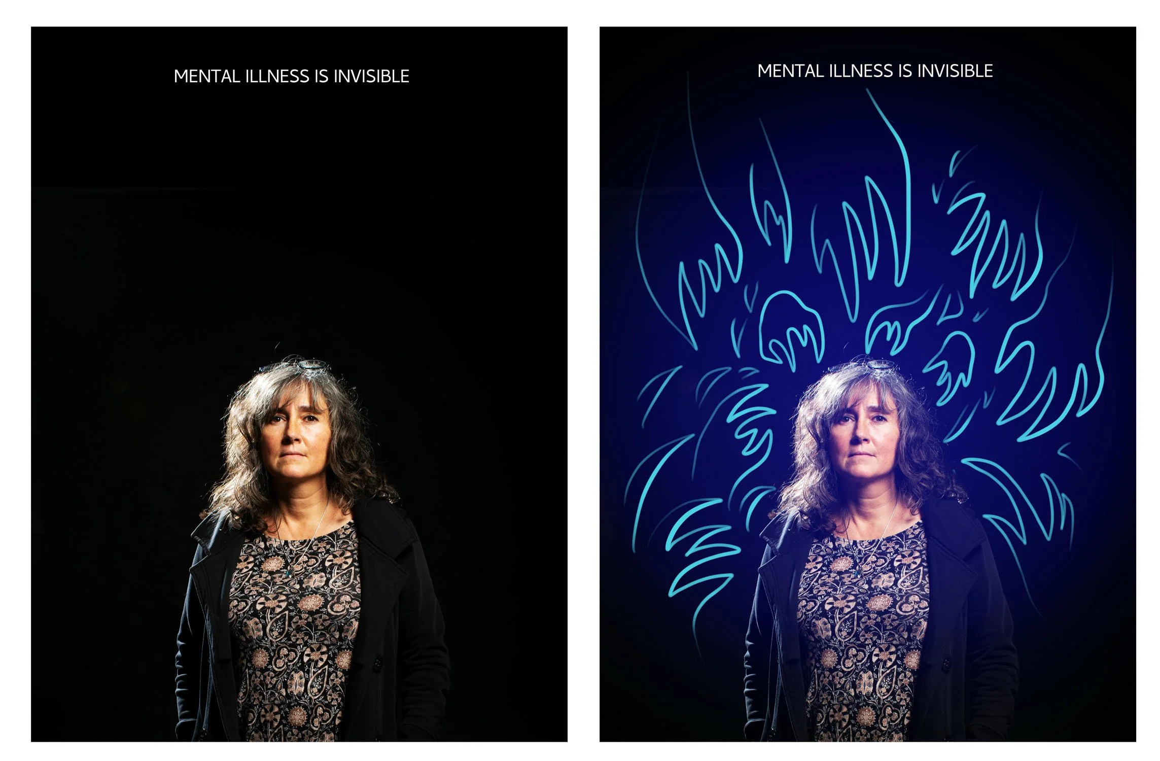 A digital ad series that compares the seriousness and invisibility of mental illnesses to UV light drawings.